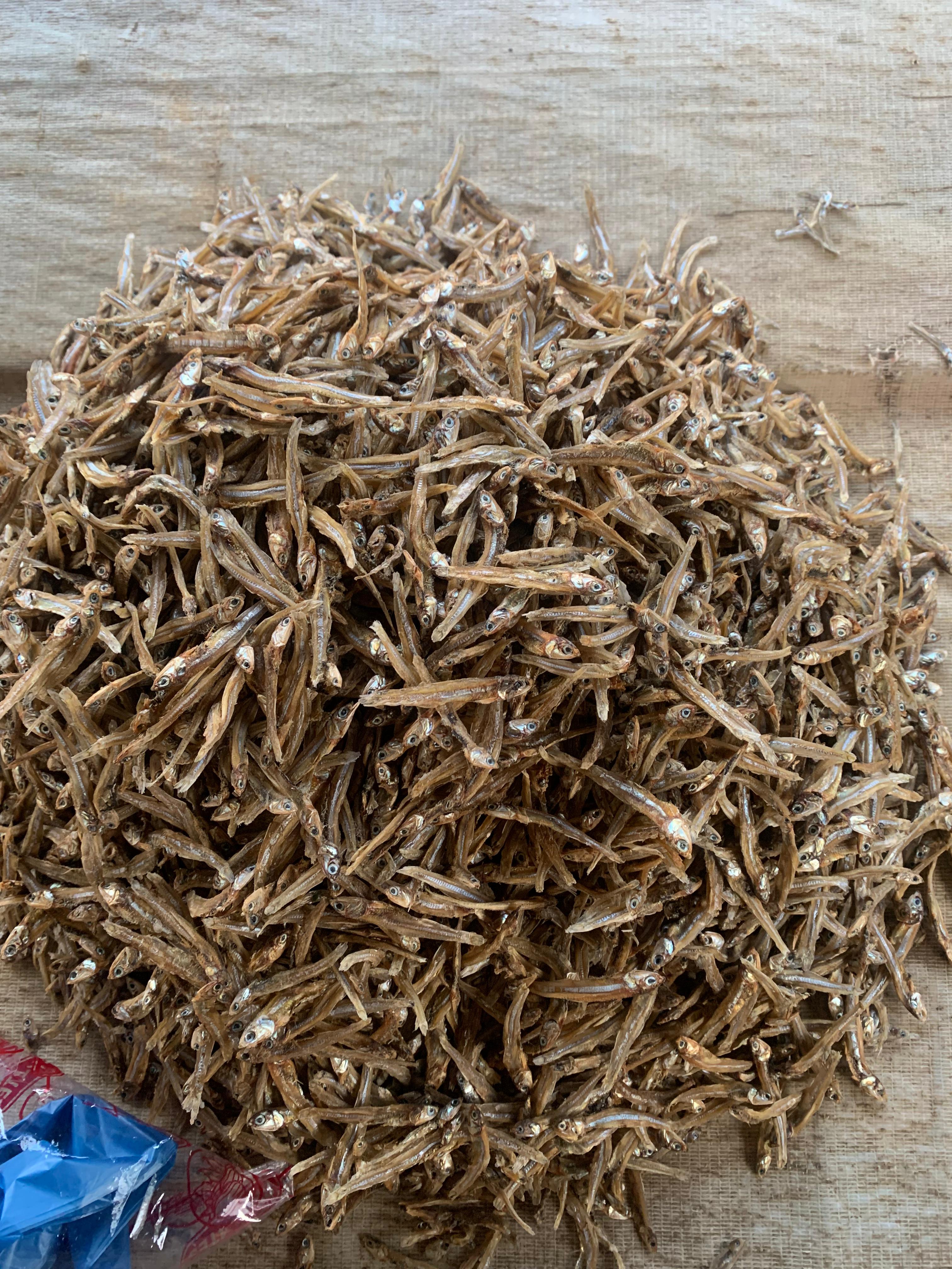 Ikan teri Medan memiliki ukuran kecil dengan bentuk tubuh ramping dan memanjang berwarna cokelat keemasan dengan kilau keperakan pada bagian kepala dan sisiknya Kondisinya tampak kering dan utuh menunjukkan bahwa ikan ini telah melalui proses penjemuran yang baik Teksturnya keras dan renyah serta memiliki aroma khas laut yang kuat menjadikannya cocok untuk berbagai olahan makanan seperti gorengan atau sambal teri
